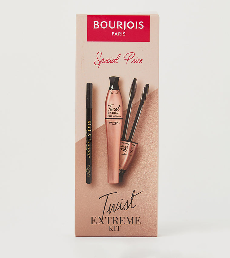 Bourjois Twist Extreme Kit with the two essentials you need for an extreme expressive eye look! Define your eyes with Bourjois Ultra Black Kohl & Contour, then finish your extreme look with Twist Extreme Fiber Mascara. With its microfiber enriched formula it will lift your lashes and boost the length to give you that fierce look! Use the brush on the first position for length then twist to the second position for volume, Et Voila! Go Extreme! Add the extreme twist kit to your favorite makeup products!